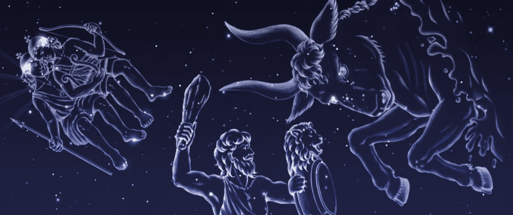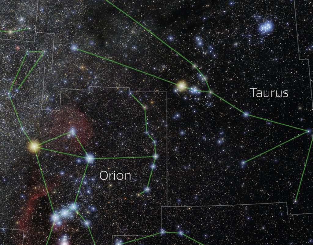 Taurus, “the Bull,” is our other zodiacal constellation found close to Orion. This constellation is depicted as a bull’s head facing the brave hunter. Aldebaran is the brightest star in this constellation, a bright red supergiant star that is known as the “Eye of the Bull.”