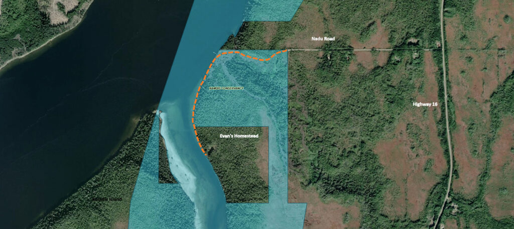 This is where Edward Evans and his sons, Francis and David, arrived in 1911 to farm in the Kumdis Slough. The Kamdis Protected Area is a significant intertidal estuarine wetland complex that provides critical habitat for waterfowl, shorebirds, and salmonids. The area’s deep history of Haida management is evident in dozens of archaeological sites, culturally modified trees, and continuing oral history.