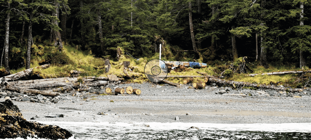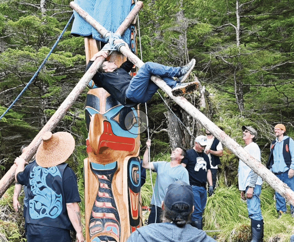 Carved by Billy Yovanovich Jr. with the Ts’aahl/Kay’ahl Laanas clan, the pole raising drew more than 30 boats to the remote west coast site. Heavy morning fog delayed arrivals, and vessels gathered offshore in the gray water while three shuttle boats ferried people through what many described as “sketchy surf.” Some elders chose to take the risk, braving the swells and potential bruises to make their way onto the small beach to witness and participate.
