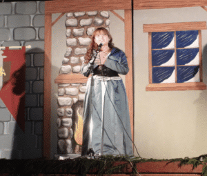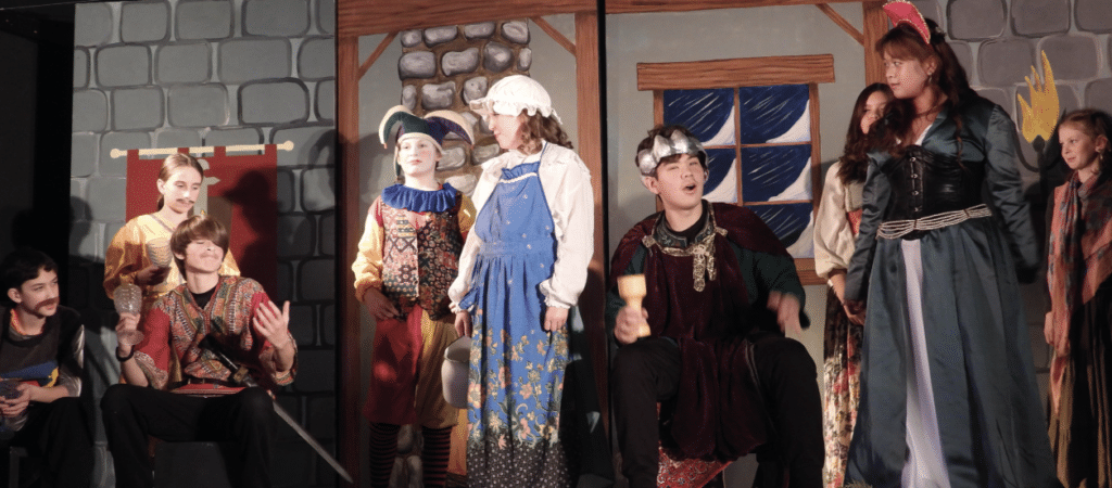The story opened at Yuletide with a grand feast at King Arthur’s court. The Jester, played by Desmond McLean, and his sister, played by Gracie, set the stage. King Arthur, played by Riley Stocker, soon announced a Christmas hunt.